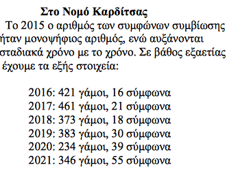 Το 2019 όπως προαναφέραμε καταγράφεται σημαντική αύξηση στα σύμφωνα συμβίωσης, 7.924 στη χώρα και 30 στο Ν. Καρδίτσας, ενώ οι γάμοι ανήλθαν 47.137 (383 στο Ν. Καρδίτσας).