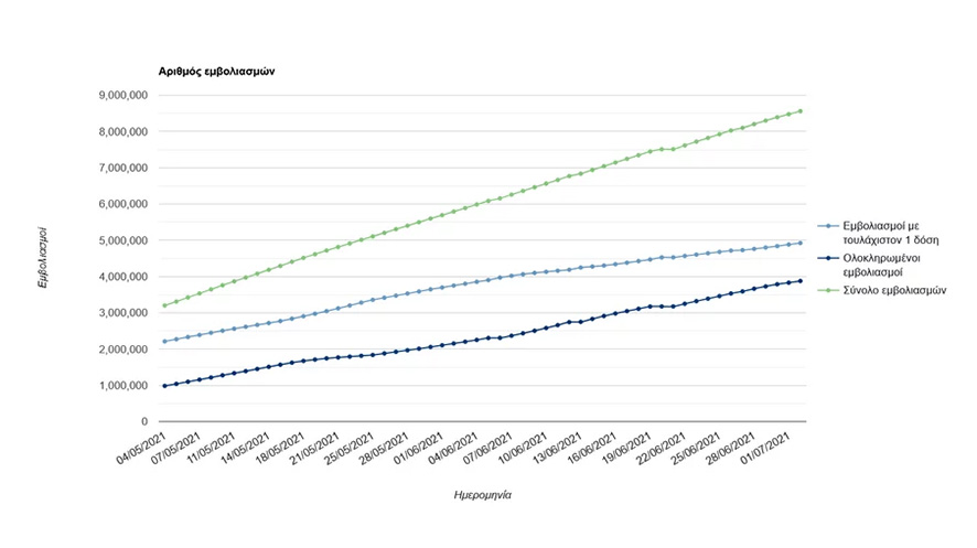 Υπό αυτά τα δεδομένα, έχουν πραγματοποιηθεί μέχρι στιγμής συνολικά 8.559.280 εμβολιασμοί, εκ των οποίων οι 3.878.045 αφορούν και τις δύο δόσεις. Οι 4.923.673 έχουν κάνει την πρώτη δόση εμβολίου σύμφωνα με τα στοιχεία του emvolio.gov.gr