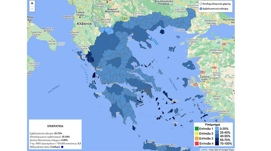 Εμβολιαστική κάλυψη (τουλάχιστον 1η δόση): 84,48% Ολοκληρωμένοι εμβολιασμοί: 78,50%