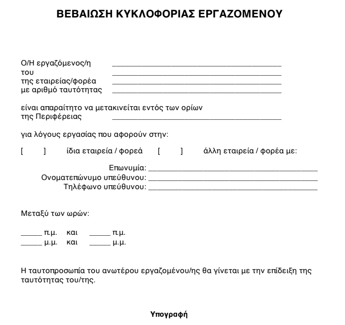 Σε περίπτωση που είναι απολύτως αναγκαία η μετακίνηση εργαζομένου εκτός έδρας θα πρέπει να φέρει μαζί του δύο βεβαιώσεις (Βεβαίωση τύπου Α’ και Βεβαίωση τύπου Β’).