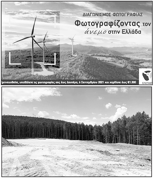 Διαγωνισμό φωτογραφίας… ανεμογεννητριών, με χρηματικό έπαθλο διοργανώνει η ΕΛΕΤΑΕΝ. «Φωτογραφίζοντας τον άνεμο στην Ελλάδα» λέει η αφίσα του διαγωνισμού και προσθέτει : «Εμπνευστείτε, υποβάλλετε τις φωτογραφίες έως 6 Σεπτέμβρη»! Φυσικά η αφίσα δεν δείχνει κάποιο παλιό παραδοσιακό ανεμόμυλο της χώρας ή τα σκάφη που