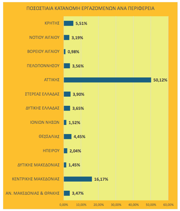 - Σποράδες: 1.446 εργαζόμενοι (0,06%)Στα σχετικά γραφήματα που διαμορφώσαμε, αποτυπώνεται καλύτερα η ενδοπεριφερειακή εικόνα.