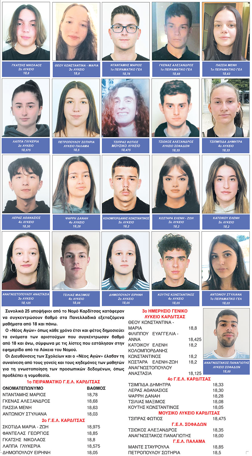 Τέλος έλαβε χθες η αγωνία για τους υποψήφιους των Πανελληνίων εξετάσεων, με την ανακοίνωση των βαθμολογιών. Συνολικά 25 μαθητές στο Νομό Καρδίτσας, έναντι 23 την περυσινή χρονιά και 32 την προπερσινή, κατάφεραν να συγκεντρώσουν βαθμό πάνω από 18