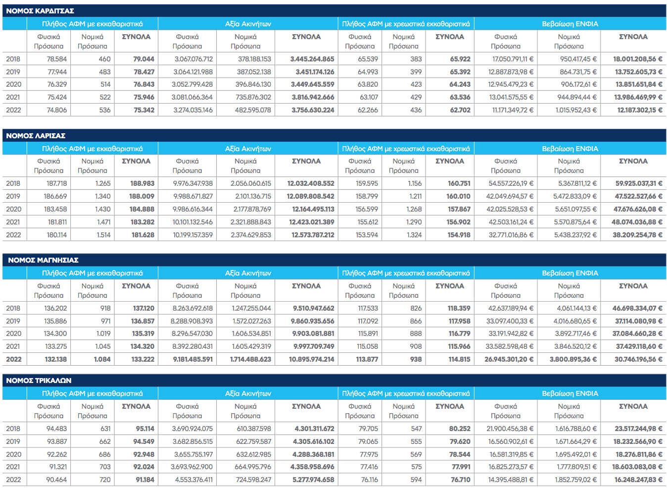 Ακίνητη περιουσία ύψους 32,5 δις ευρώ έχουν στην κατοχή τους 409.145 φυσικά και νομικά πρόσωπα στη Θεσσαλία, σύμφωνα με τα στατιστικά στοιχεία για τον ΕΝΦΙΑ του 2022 που έδωσε στην δημοσιότητα η ΑΑΔΕ.