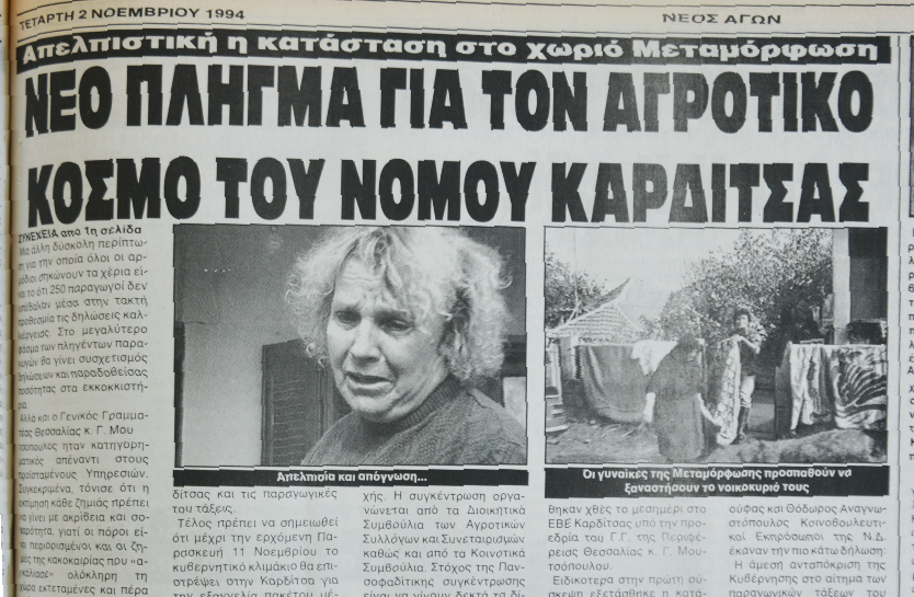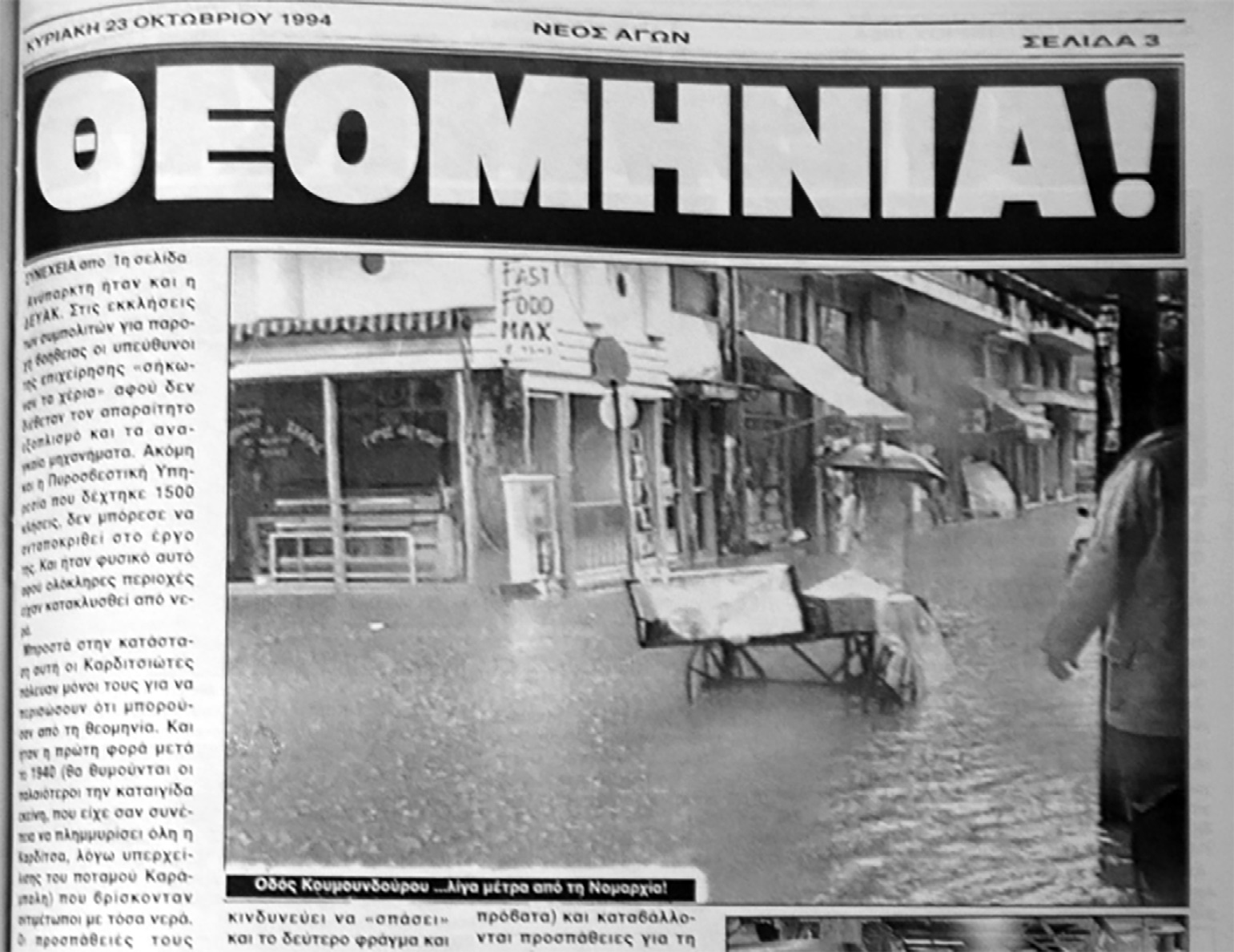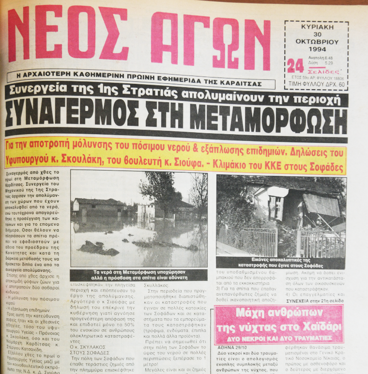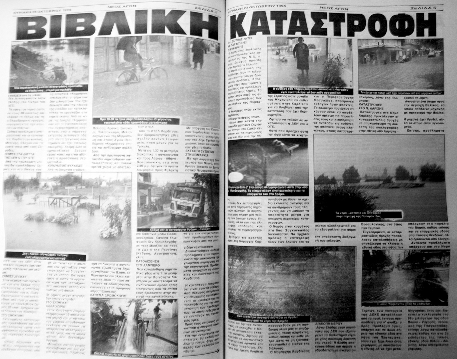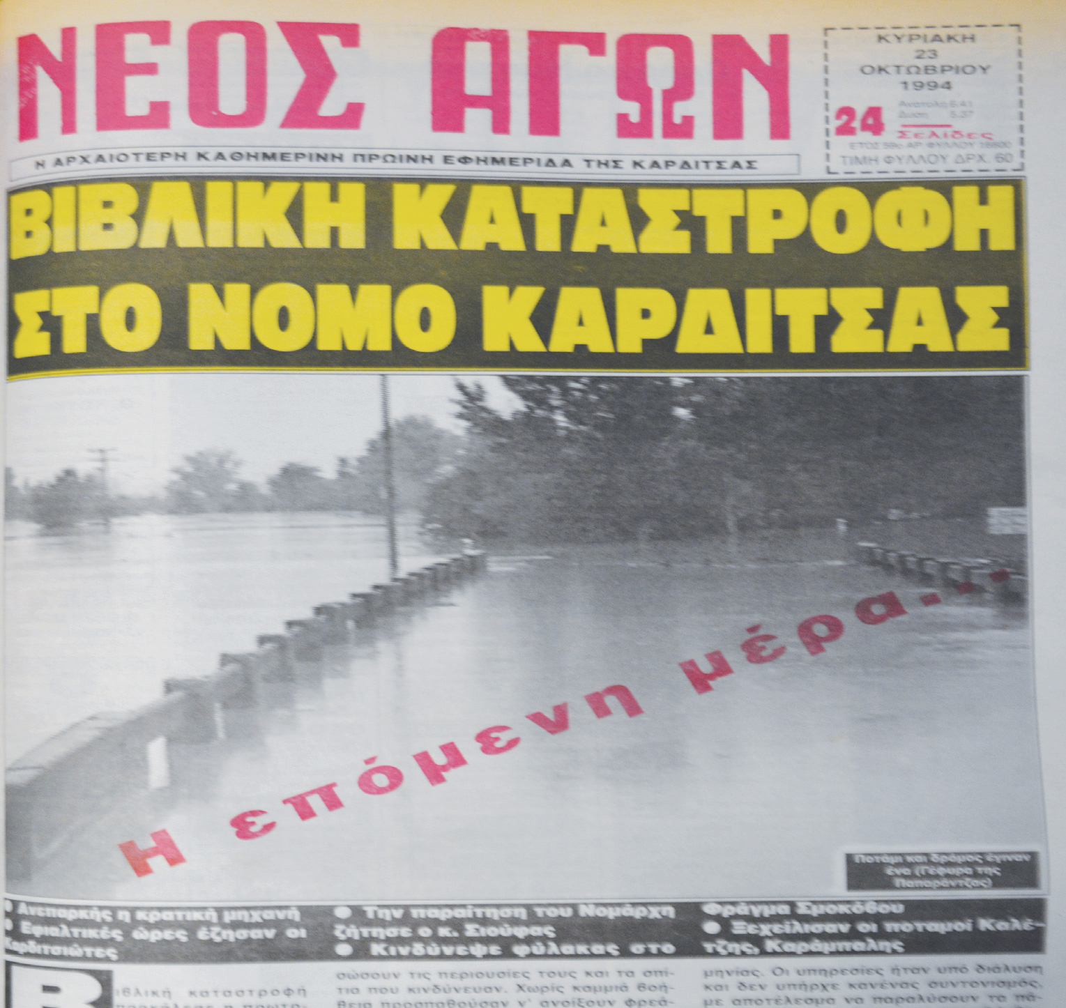 Το πρωτοσέλιδο του «Νέου Αγώνα» της 23ης Οκτωβρίου 1994 έγραφε: «Βιβλική καταστροφή στο Νομό Καρδίτσας, ανεπαρκής η κρατική μηχανή, εφιαλτικές ώρες έζησαν οι Καρδιτσιώτες»