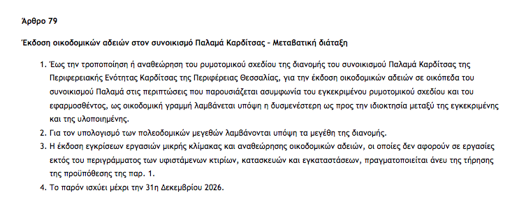 Όπως καταγράφει ο Νέος Αγών, στο Άρθρο 79 του Σχέδιο Νόμου του Υπουργείου Περιβάλλοντος για τον εκσυγχρονισμό του πλαισίου υπηρεσιών ύδρευσης και αποχέτευσης που έχει τεθεί σε δημόσια διαβούλευση μέχρι τις 28 Φεβρουαρίου, περιλαμβάνεται η μεταβατική διάταξη για «την έκδοση οικοδομικών αδειών στον συνοικισμό Παλαμά Καρδίτσας» η οποία αναφέρει: