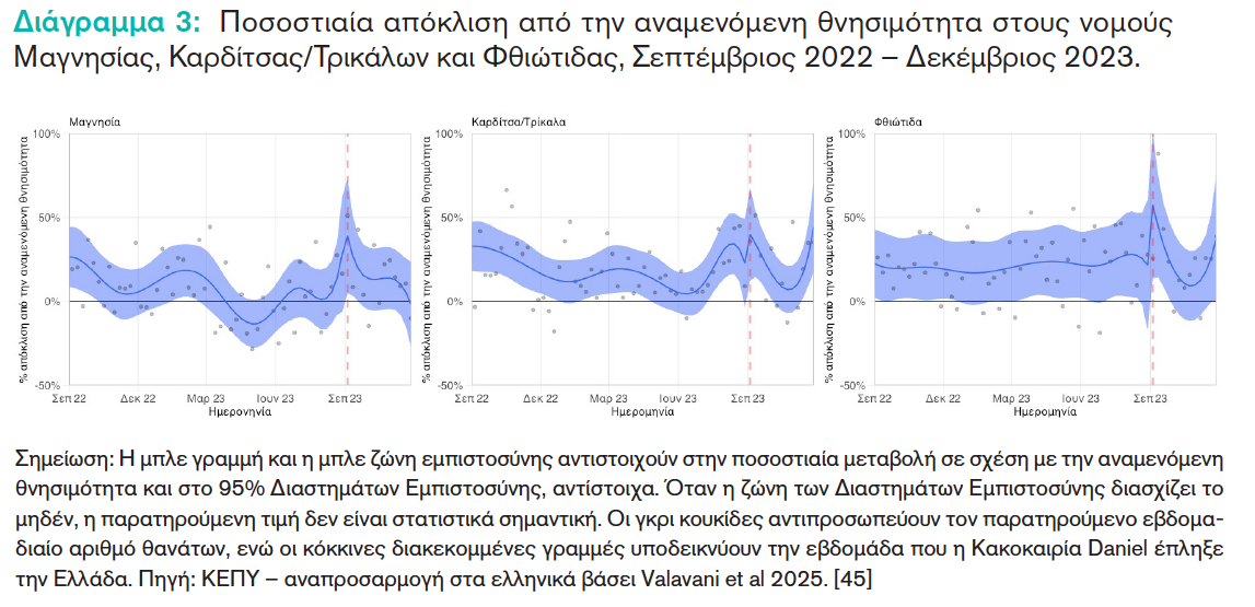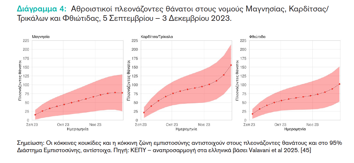 Τέλος, αν και στοιχεία σχετικά με τις αιτίες θανάτων για την χρονική περίοδο 2023-24 δεν είναι ακόμη διαθέσιμα, μέρος μόνο της πλεονάζουσας ολικής θνησιμότητας που καταγράφηκε στη Θεσσαλία και τη Στερεά Ελλάδα μπορεί να αποδοθεί στους δηλωθέντες άμεσους θανάτους της πλημμύρας, ή τους δηλωθέντες θανάτους τους σχετιζόμενους με τις εξάρσεις λοιμωδών και υδατογενών/τροφιμογενών νοσημάτων που παρατηρήθηκαν στις πληγείσες περιοχές μετά την πλημμύρα. Βάσει της διεθνούς βιβλιογραφίας, η ερευνητική ομάδα υποθέτει πως το μεγαλύτερο μέρος της πλεονάζουσας θνησιμότητας προήλθε από καρδιαγγειακά ή/και αναπνευστικά νοσήματα κύρια λόγω της γενικευμένης επιδείνωσης των κοινωνικοοικονομικών καθοριστών της υγείας στους πληγέντες πληθυσμούς ή/και της διατάραξης της πρόσβασης τους σε υπηρεσίες υγείας.