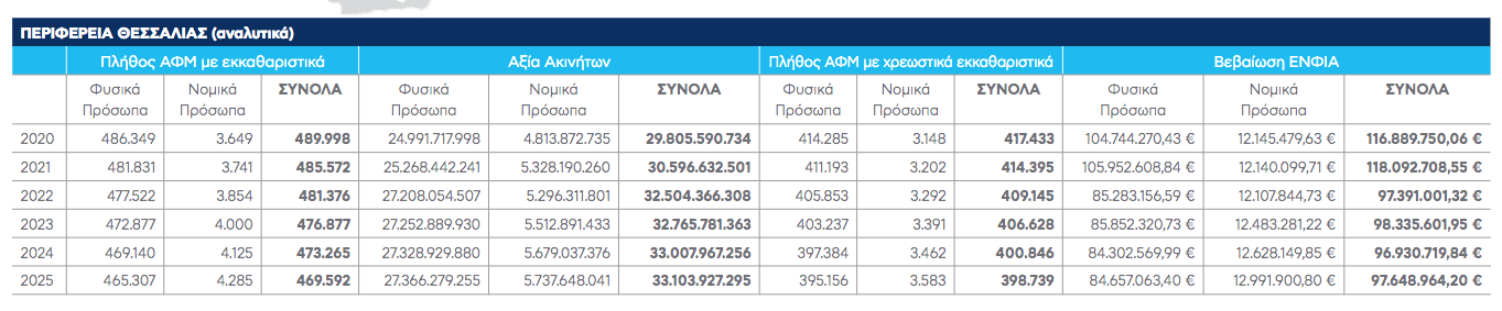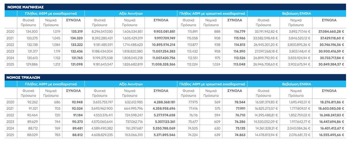 Σε ότι αφορά τους υπόλοιπους Νομούς για το 2025, η αξία των ακινήτων στο Ν. Λάρισας ανέρχεται σε 12,78 δις ευρώ (ΕΝΦΙΑ 38,29 εκ ευρώ), στη Μαγνησία 11 δις ευρώ (ΕΝΦΙΑ 30,84 εκ ευρώ) και Τρίκαλα 5,37 δις ευρώ (ΕΝΦΙΑ 16,55 εκ ευρώ).