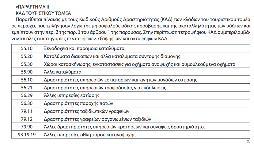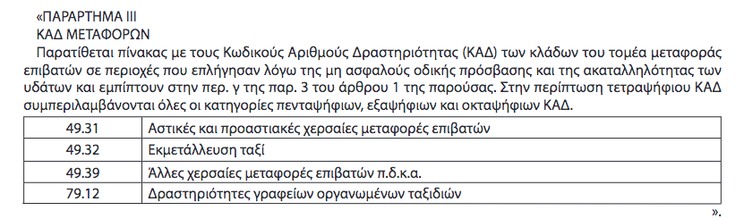Ειδικά επιχειρήσεις που έκαναν έναρξη εργασιών από 1.1.2023 ως 4.09.2023, έχουν ενεργό κύριο ΚΑΔ κατά την 4η Σεπτεμβρίου 2023 που ανήκει στους ΚΑΔ του Παραρτήματος ΙΙΙ. Ειδικά επιχειρήσεις με ενεργό κύριο ΚΑΔ που ανήκει στους ΚΑΔ της κατηγορίας 79.12 ή με τα ακαθάριστα έσοδα ενεργού κατά την 30ή Ιουνίου 2023 ΚΑΔ δευτερεύουσας δραστηριότητας που ανήκει στους ΚΑΔ της κατηγορίας 79.12 του Παραρτήματος ΙΙΙ, θα πρέπει να εκμεταλλεύονται τουριστικά λεωφορεία.».
