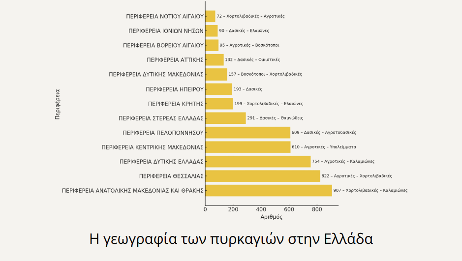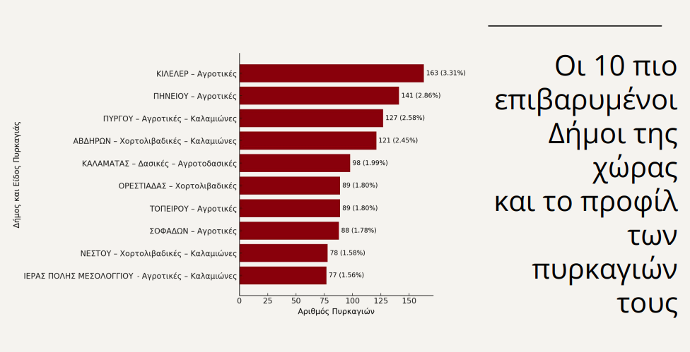 Σε επίπεδο τοπικής διοίκησης, δέκα Δήμοι συγκεντρώνουν περίπου 22% του συνολικού αριθμού πυρκαγιών της χώρας, κυρίως στις Περιφέρειες Θεσσαλίας, Δυτικής Ελλάδας και Ανατολικής Μακεδονίας και Θράκης.