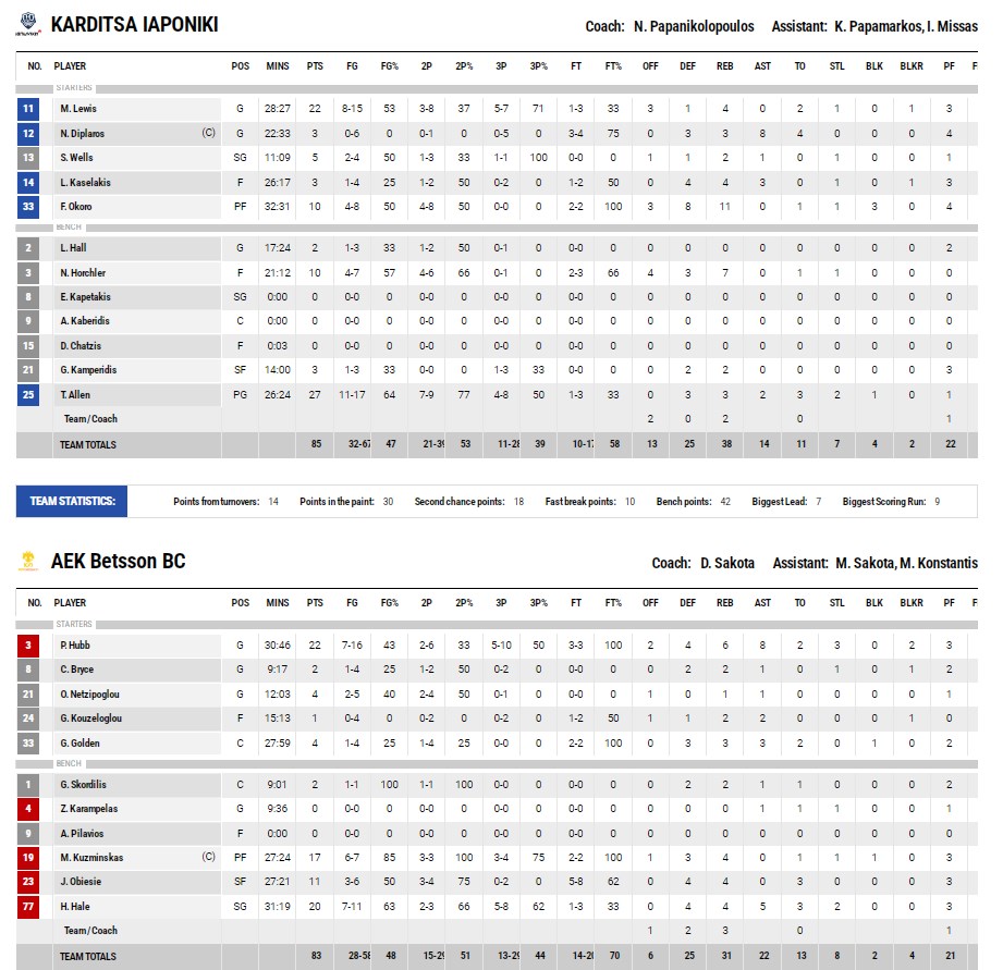 ΑΣ ΚΑΡΔΙΤΣΑΣ ΙΑΠΩΝΙΚΗ (Παπανικολόπουλος): Λούις 22 (3/8 δίποντα, 5/7 τρίποντα, 1/3 βολές, 4 ριμπάουντ), Δίπλαρος 3 (0/6 σουτ, 3/4 βολές, 3 ριμπάουντ, 8 ασίστ, 4 λάθη), Γουέλς 5 (1), Κασελάκης 3 (1/4 σουτ, 1/2 βολές, 4 ριμπάουντ, 3 ασίστ), Οκόρο 10 (4/8 δίποντα, 2/2 βολές, 11 ριμπάουντ, 3 μπλοκ), Χολ 2, Χόρχλερ 10 (4/6 δίποντα, 2/3 βολές, 7 ριμπάουντ), Χατζής, Καμπερίδης 3 (1), Άλεν 27 (7/9 δίποντα, 4/8 τρίποντα, 1/3 βολές, 3 ριμπάουντ, 2 ασίστ, 2 κλεψίματα)