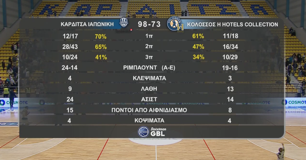 Τα ομαδικά στατιστικά του Κολοσσού: 16/34 δίποντα, 10/29 τρίποντα, 11/18 βολές, 35 ριμπάουντ, 14 ασίστ, 13 λάθη, 3 κλεψίματα, 4 τάπες