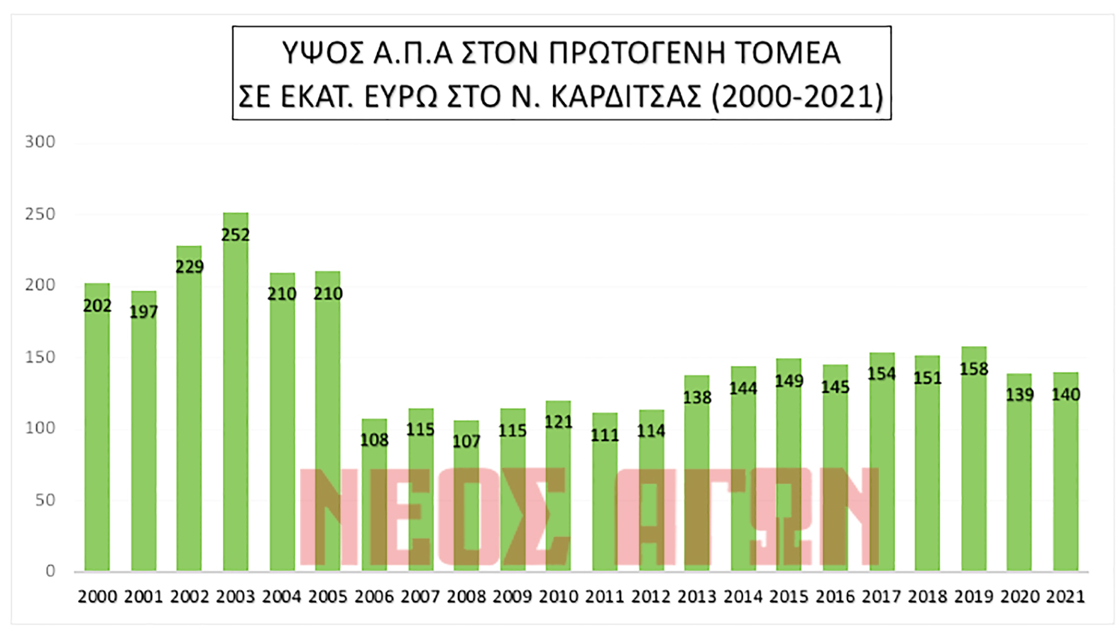 Ένα σημαντικό στοιχείο αφορά την συνεισφορά του πρωτογενή τομέα στην Ακαθάριστη Προστιθέμενη Αξία του Νομού. Όπως φαίνεται στο σχετικό σχεδιάγραμμα που παραθέτουμε, η ΑΠΑ στον πρωτογενή τομέα υπέστη μια πρωτοφανή βύθιση στα μέσα της δεκαετίας 2000-2010. Το διάστημα αυτό, όπως μας ερμήνευσαν έμπειροι κύκλοι του αγροτικού κινήματος της περιοχής, άρχισε η εφαρμογή της αναθεωρημένης Κοινής Αγροτικής Πολιτικής (ΚΑΠ) με την επιδότηση να αποσυνδέεται από την παραγωγή. Πέρασε στην καλλιέργεια με τα ιστορικά δικαιώματα, ήρθαν και οι ποσοστώσεις (πχ περιορισμός στη ζάχαρη που οδήγησε στο ξεκλήρισμα της τευτλοπαραγωγής) και τότε ήταν που σημειώθηκε ένα μεγάλο κύμα φυγής από τον πρωτογενή τομέα στο Ν. Καρδίτσας. Από το 2012 σημειώνεται μια σταθερή ανοδική πορεία της ΑΠΑ στον πρωτογενή τομέα, δίχως όμως να φτάσει στα επίπεδα που ήταν από το 2005 και νωρίτερα.