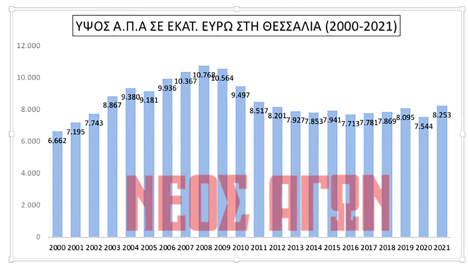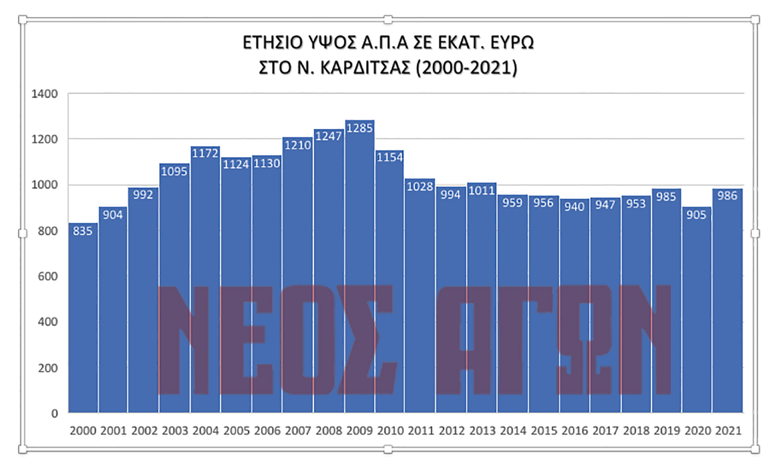 Σε ανάλυση την προηγούμενη Κυριακή (εδώ), παρουσιάσαμε το αποτύπωμα των στοιχείων της ΕΛΣΤΑΤ για το κατά κεφαλήν ΑΕΠ το 2021 και σε βάθος 21ετίας, με βάση τα οποία ο Ν. Καρδίτσας είναι ουραγός στη Θεσσαλία και στους 10 φτωχότερους Νομούς της χώρας.