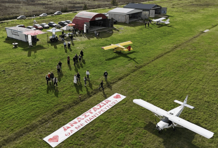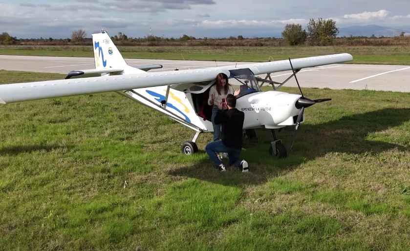 Ο Βασίλης έχοντας ως συνεργούς συγγενείς και φίλους άπλωσε ένα τεράστιο πανό δίπλα στον διάδρομο προσγείωσης με την απλή ερώτηση: “Αναστασία, θα με παντρευτείς;” και πέταξε με το αεροσκάφος που ο ίδιος πιλοτάριζε πάνω από αυτό αναμένοντας με αγωνία την απάντηση της καλής του. Φυσικά η Αναστασία έμεινε άφωνη και όταν προσγειώθηκαν αφού ο Βασίλης ως σωστός ιππότης, γονάτισε και της πρόσφερε το δαχτυλίδι, εκείνη συγκινημένη έπεσε στην αγκαλιά του και είπε το πολυπόθητο “ναι”. Οσοι βρίσκονταν στο αεροδρόμιο εκείνη τη στιγμή ξέσπασαν σε χειροκρότηματα συγκινημένοι αφού έγιναν μάρτυρες αυτής της τόσο ρομαντικής σκηνής.