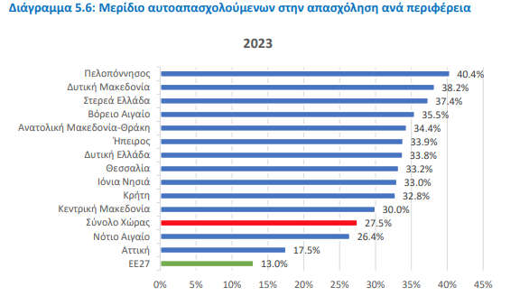 Σε αυτή την απόκλιση, αναδεικνύεται ότι κομβικό ρόλο διαδραματίζουν οι περιφέρειες εκτός Αττικής. Ενδεικτικά, στις 9 από τις 13 περιφέρειες της χώρας, τουλάχιστον1 στους 3 εργαζόμενους είναι αυτοαπασχολούμενος. Χαμηλότερα ποσοστά καταγράφουν μόνο οι περιφέρειες Αττικής, Νοτίου Αιγαίου, Κεντρικής Μακεδονίας και Κρήτης.