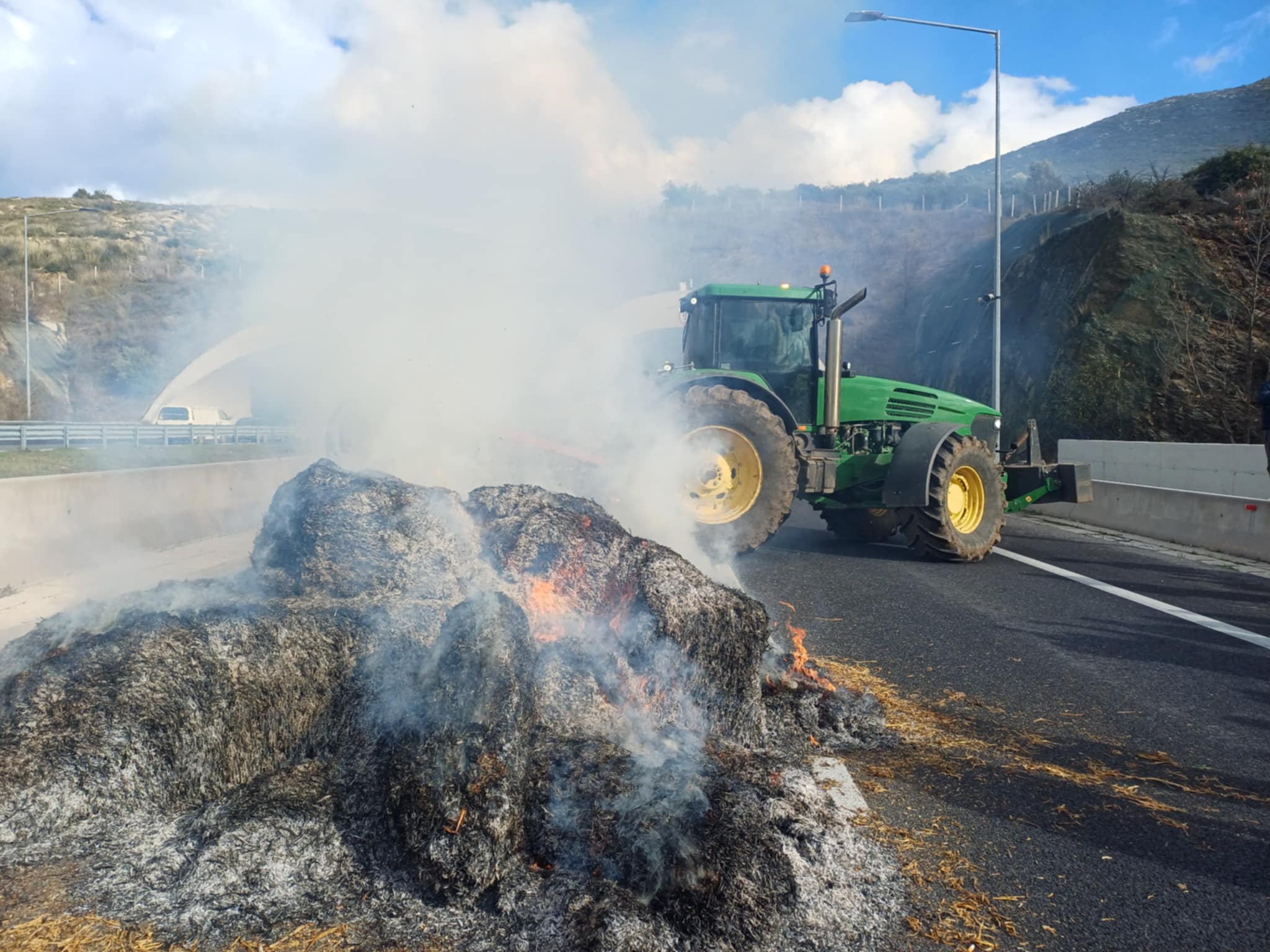 Σε αποκλεισμό προχώρησαν οι αγρότες από τη Νίκαια στις σήραγγες των Τεμπών, παρατάσσοντας τρακτέρ και αγροτικά μηχανήματα και διακόπτοντας την κυκλοφορία στο σημείο, ενώ έβαλαν φωτιά σε μπάλες από άχυρο.