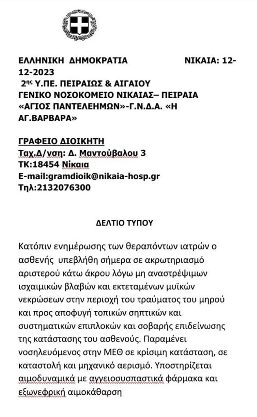 Κατόπιν ενημέρωσης των θεραπόντων ιατρών, ο ασθενής υπεβλήθη σήμερα σε ακρωτηριασμό αριστερού κάτω άκρου λόγω μη αναστρέψιμων ισχαιμικών βλαβών και εκτεταμένων μυϊκών νεκρώσεων στην περιοχή του τραύματος του μηρού και προς αποφυγή τοπικών σηπτικών και συστηματικών επιπλοκών και σοβαρής επιδείνωσης της κατάστασης του ασθενούς. Παραμένει νοσηλευόμενος στην ΜΕΘ σε κρίσιμη κατάσταση, σε καταστολή και μηχανικό αερισμό. Υποστηρίζεται αιμοδυναμικά με αγγειοσυσπαστικά φάρμακα και εξωνεφρική αιμοκάθαρση.