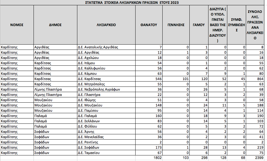 Στους 1.802 ανέρχονται οι συνάνθρωποί μας που έφυγαν από τη ζωή το 2023 στο Ν. Καρδίτσας με βάση τα ολοκληρωμένα συγκεντρωτικά στοιχεία των ληξιαρχείων που σας παρουσιάζει ο Νέος Αγών.