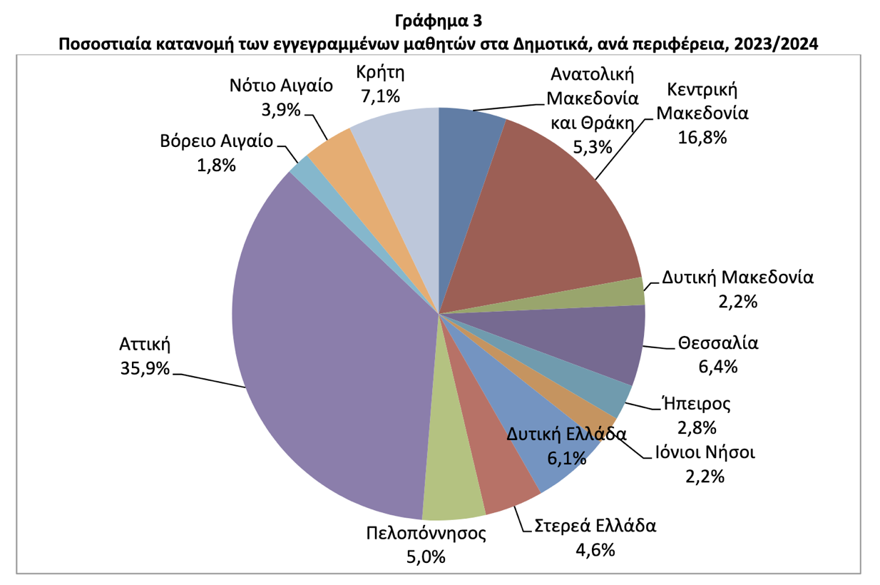 Οι εγγεγραμμένοι μαθητές κατά το σχολικό έτος 2023/2024, παρουσίασαν μείωση κατά 3,1% στα νηπιαγωγεία και κατά 2,1% στα δημοτικά μέσα σε ένα σχολικό έτος.