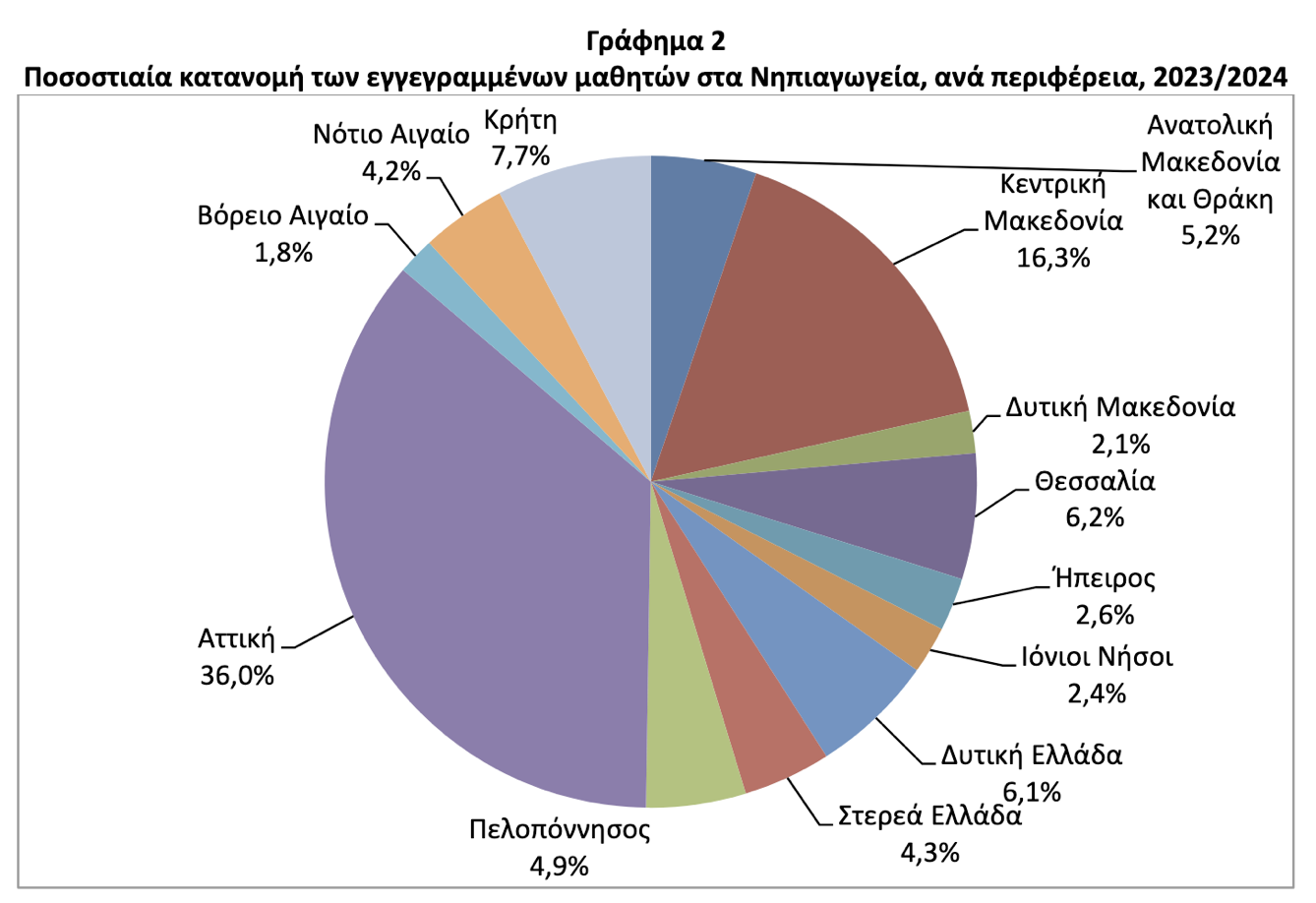 Το σύνολο των εγγεγραμμένων μαθητών στα νηπιαγωγεία της Θεσσαλίας ανήλθε σε 10.479 το 2023/2024 έναντι 10.869 το 2022/2023 (μείωση -3,6%) και στα δημοτικά 35.851 έναντι 36.917 (μείωση 2,9%).