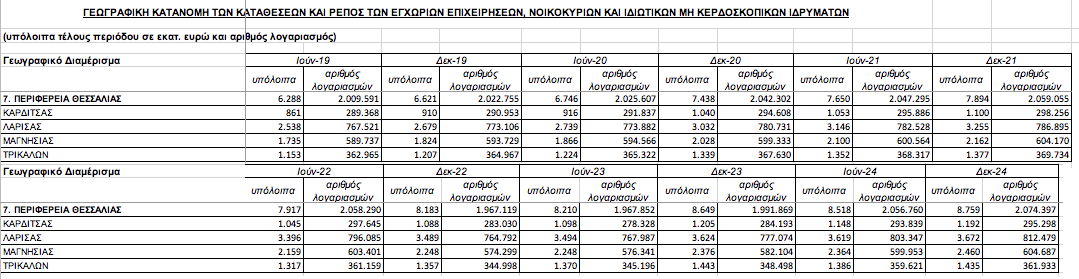 Ο Νομός Καρδίτσας καταγράφει το χαμηλότερο ποσό καταθέσεων σε σύγκριση με τους υπόλοιπους Θεσσαλικούς Νομούς. Μικρή μείωση των καταθέσεων εμφανίζει και ο Νομός Τρικάλων. Οι καταθέσεις στο β’ εξάμηνο του 2024 διαμορφώθηκαν στα 1,435 δις ευρώ, από 1,443 δις στο β’ εξάμηνο του ’23. Ανοδικά στο αντίστοιχο διάστημα κινήθηκαν οι καταθέσεις στους Νομούς Λάρισας ( 3,67 δις από 3,62 δις ευρώ) και Μαγνησίας (2,46 δις από 2,37δις).