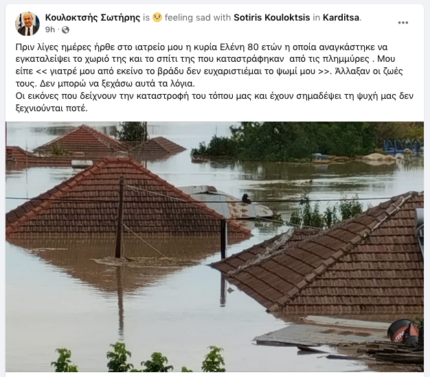 «Πριν λίγες ημέρες ήρθε στο ιατρείο μου η κυρία Ελένη 80 ετών η οποία αναγκάστηκε να εγκαταλείψει το χωριό της και το σπίτι της που καταστράφηκαν από τις πλημμύρες . Μου είπε << γιατρέ μου από εκείνο το βράδυ δεν ευχαριστιέμαι το ψωμί μου >>. Άλλαξαν οι ζωές τους. Δεν μπορώ να ξεχάσω αυτά τα λόγια.