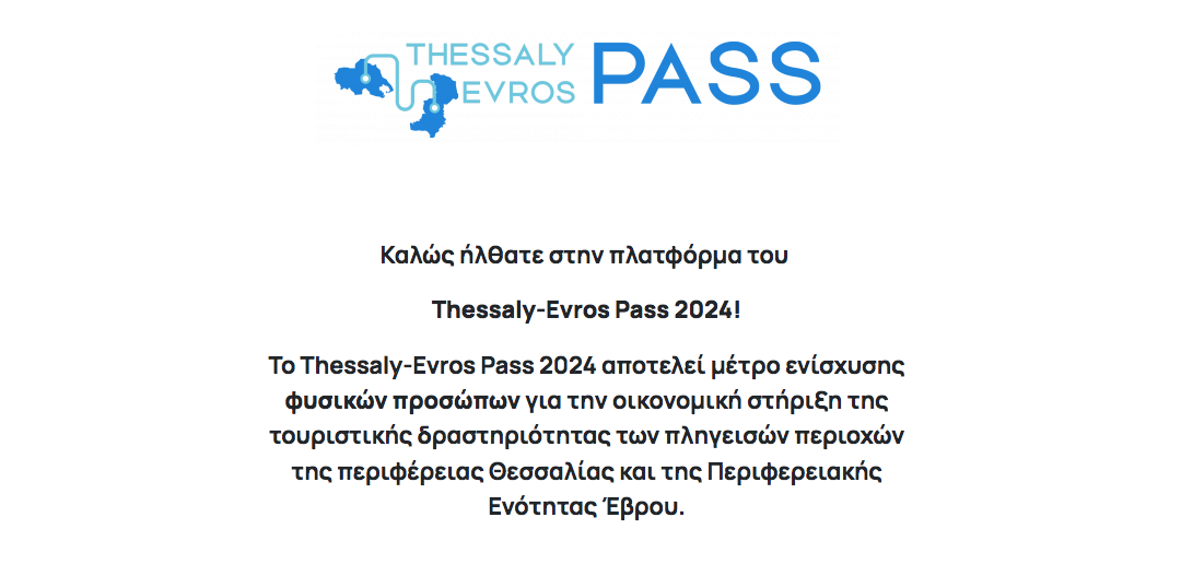 Άνοιξε σήμερα Tρίτη 25 Ιουνίου η πλατφόρμα των αιτήσεων για το «Thessaly & Evros Pass 2024», συνολικού προϋπολογισμού 4,45 εκατ. ευρώ.