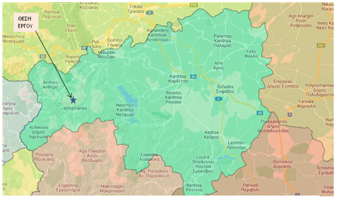 Μουζακίου και η 1 στον Δήμο Αργιθέας. Τα συνοδά έργα οδοποιίας και ηλεκτρικής διασύνδεσης, χωροθετούνται κατά τμήματα στον Δ. Αργιθέας και στον Δ. Μουζακίου. Το γήπεδο εγκατάστασης του αιολικού σταθμού, εκτάσεως 786.017,49 m2 (+892,128 αυλάκι καλωδιων ή 1.496.196 μ2 όλο το πολύγωνο σελ 187) βρίσκεται σε απόσταση περίπου 2.000μ. ανατολικά του οικισμού Αργιθέας, 1.900 μ. δυτικά του οικισμού Οξυάς,.