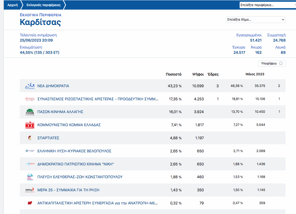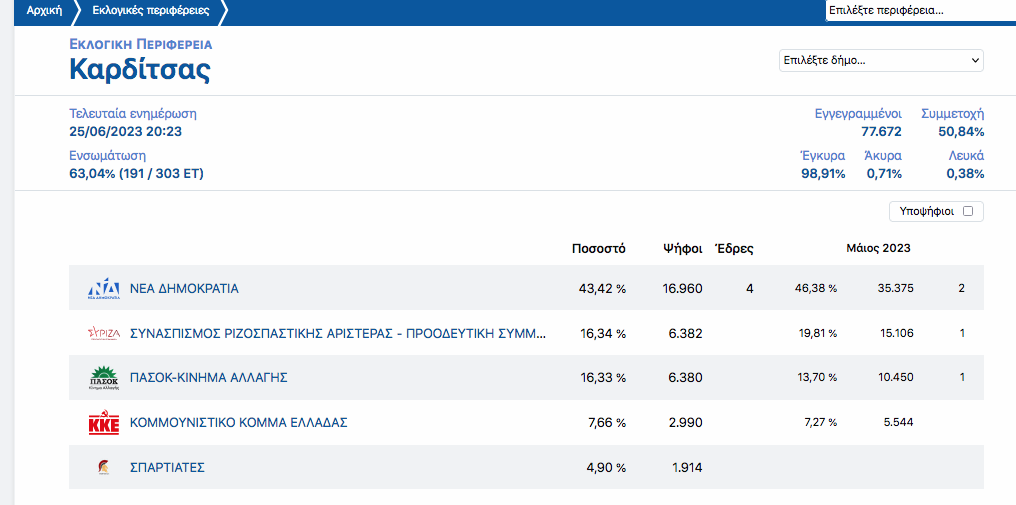 Στο 69% των αποτελεσμάτων στο Ν. Καρδιτσας οι έδρες διαμορφώνονται 3 για τη ΝΔ και 1 για το ΠΑΣΟΚ