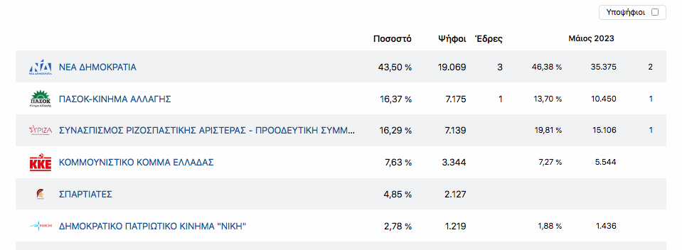 Οι τρεις έδρες «κλειδώνουν» στη Νέα Δημοκρατία, ενώ η 4η φαίνεται ότι παίζει μεταξύ ΝΔ- ΣΥΡΙΖΑ και ΠΑΣΟΚ.