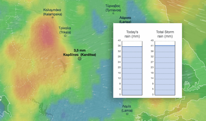 Σύμφωνα με τα μετεωρολογικά δεδομένα από τους σταθμούς του Εθνικού Αστεροσκοπείου, όπως καταγράφει ο ΝΕΟΣ ΑΓΩΝ, στην Καρδίτσα έχουν πέσει από την έναρξη της κακοκαιρίας και μέχρι τις 9:30 το πρωί σήμερα (2/10) 41 χιλιοστά βροχής, και στο Μουζάκι 75.