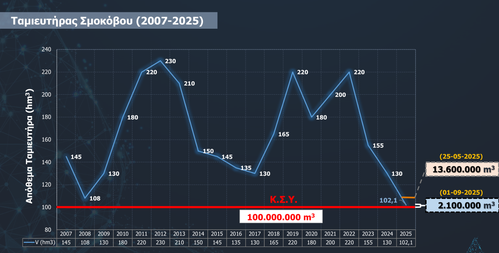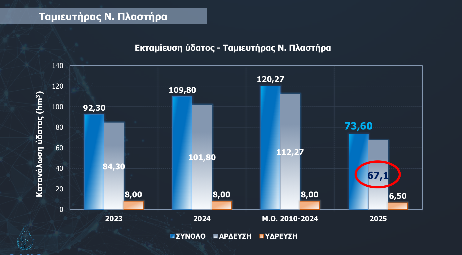 Οι αντίστοιχες εκταμιεύσεις πέρυσι ήταν 109,8 εκατ. κυβικά και 101,80 εκατ. κυβικά αντίστοιχα, ενώ το 2023 ήταν 92,30 εκατ. κυβικά και 84,30 εκατ. κυβικα αντίστοιχα. Στην 15ετία 2010-2024 ο μέσος όρος της εκταμίευσης ήταν 120,27 εκατ. κυβικά, από τα οποία για άρδευση 112,27 εκατ. κυβικά. Δηλαδή φέτος εκταμιεύτηκε το 60% συγκριτικά με την προηγούμενη 15ετία.