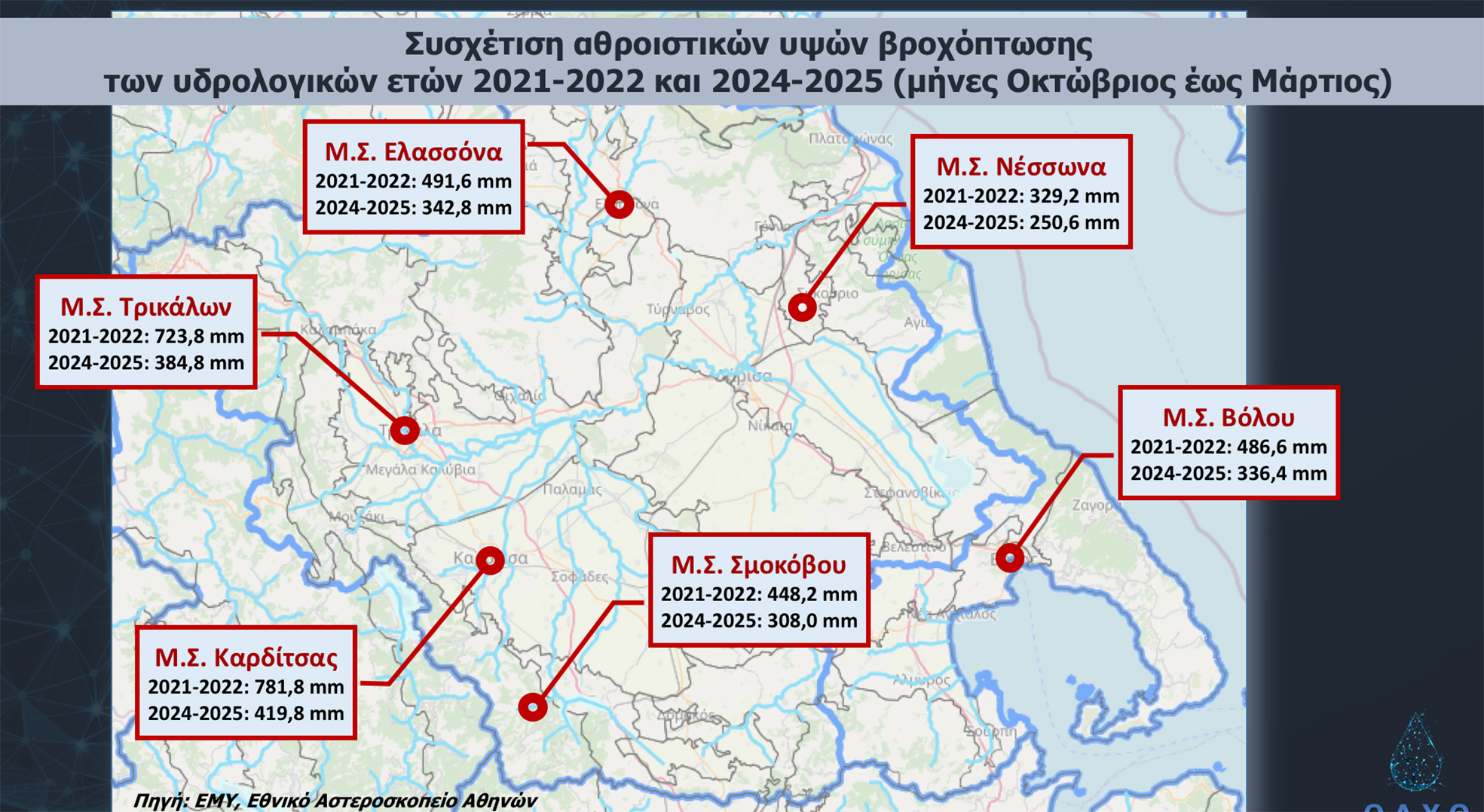Το τρέχον έτος χαρακτηρίστηκε από έναν φτωχό υδρολογικά χειμώνα και μάλιστα για δεύτερη συνεχόμενη χρονιά, καθώς παρατηρήθηκε μείωση των βροχοπτώσεων και των χιονοπτώσεων κατά 30 έως 50%, με αποτέλεσμα οι ροές στα επιφανειακά υδάτινα σώματα και στους ταμιευτήρες του ΥΔ Θεσσαλίας, ήδη ελλειμματικού αναφορικά με το ισοζύγιο νερού, να είναι μειωμένες.