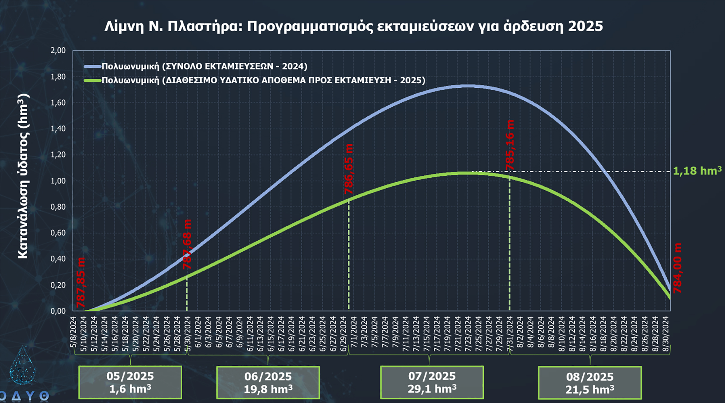 Δεδομένων αυτών των δυσμενών συνθηκών, είχε αποφασιστεί από τον ΟΔΥΘ, με τη σύμφωνη γνώμη των φορέων διαχείρισης, να ολοκληρωθεί η αρδευτική περίοδος πολύ νωρίτερα μέσα στον Αύγουστο, δεδομένου ότι θα είχε προσεγγιστεί το οικολογικό όριο των 784 μ. πριν τα μέσα Αυγούστου.