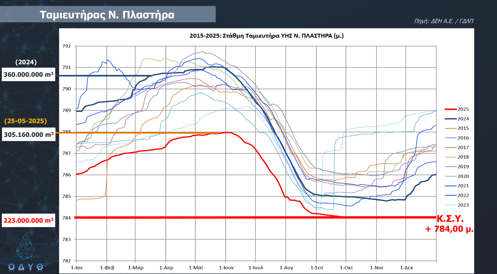 Σε κάθε περίπτωση, η τήρηση του θεσμοθετημένου οικολογικού ορίου της λίμνης Ν. Πλαστήρα υπήρξε και αποτελεί αυστηρώς απαράβατη συνθήκη για τον ΟΔΥΘ. Επισημαίνεται ότι η συνθήκη αυτή, κατά το παρελθόν, σε αντίστοιχες περιόδους περιορισμένων υδατικών αποθεμάτων όπως η τριετία 2007-09, δεν πληρούνταν κατά κανόνα, με αποκορύφωμα το έτος 2008, όπου η στάθμη ύδατος της λίμνης κατήλθε σχεδόν τρία μέτρα (3 μ.) κάτω από το οικολογικό όριο των 784 μ., προκειμένου να ικανοποιηθούν οι αρδευτικές ανάγκες των καλλιεργειών.