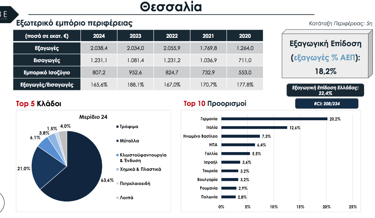 Πέμπτη στις εξαγωγικές επιδόσεις στη χώρα ήταν η Θεσσαλία το 2024, πίσω από Αττική, Κεντρική Μακεδονία, Πελοπόννησο και Στ. Ελλάδα. Οι τρεις πρώτες, ούτε λίγο ούτε πολύ καταλαμβάνουν το 82%, ενώ η Θεσσαλία το 4,1% σύμφωνα με τη μελέτη «Χαρτογράφηση της εξαγωγικής δραστηριότητας της Ελλάδας ανά περιφέρεια» για το διάστημα 2020-2024 που εκπόνησε ο ΣΕΒΕ – Σύνδεσμος Εξαγωγέων.
