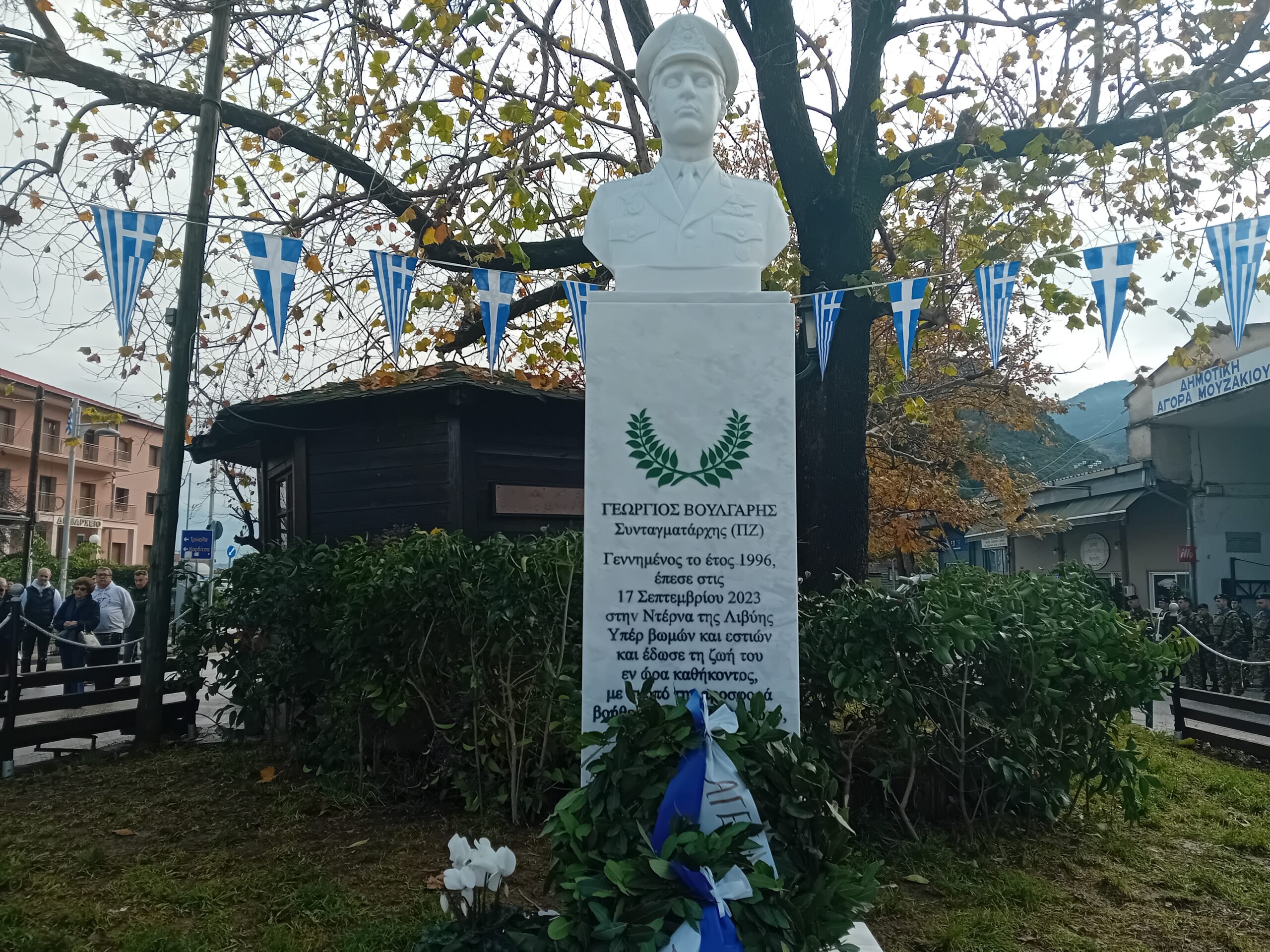 Σε κλίμα βαθιάς συγκίνησης πραγματοποιήθηκαν πριν λίγο στην Δημοτική Αγορά του Μουζακίου τα αποκαλυπτήρια της προτομής του Μουζακιώτη στρατιωτικού Γεωργίου Βούλγαρη που έχασε τη ζωή του σε ηλικία 27 ετών στη Λιβύη στις 17 Σεπτεμβρίου του 2023. Ο Υπουργός Εθνικής Άμυνας κ. Νικ. Δένδιας τελικά δεν μπόρεσε να παραβρεθεί στην τελετή, με τα αποκαλυπτήρια να κάνει ο Αρχηγός ΓΕΕΘΑ, Στρατηγός Δημήτριος Χούπης μαζί με το Δήμαρχο Μουζακίου κ. Θεοφ. Στάθη και την οικογένεια του Γεωργ Βούλγαρη. Χαιρετισμούς απηύθυναν ο Δήμαρχος Μουζακίου κ. Θεοφ. Στάθης και η αδελφή του Γεωργίου Βούλγαρη, Ανθυπασπιστής Ευτυχία Βούλγαρη.