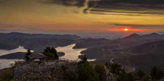 Φθινόπωρο στη Λίμνη Πλαστήρα σε φόντο χρυσοκίτρινο και γαλάζιο...