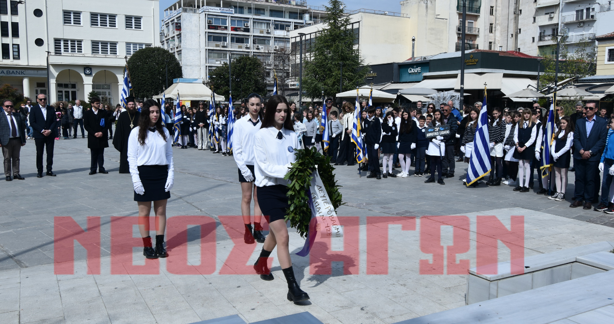 Κατάθεση στεφάνων για την εορτή της 25ης Μαρτίου 1821 πραγματοποιήθηκε σήμερα το πρωί από μαθητές σχολείων της Καρδίτσας, στο άγαλμα του Καραϊσκάκη στην κεντρική πλατεία.