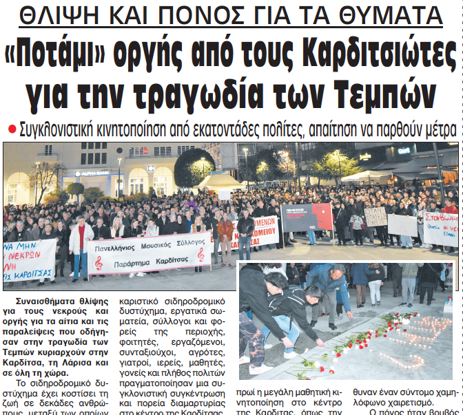 Από τις πρώτες ημέρες μετά την τραγωδία και τις μεγαλειώδεις κινητοποιήσεις μέχρι και σήμερα, η αίσθηση της απώλειας παραμένει έντονη. Άλλωστε δεν απέχει και πολύ από την πραγματικότητα η πιθανότητα να ήταν ένα δικό μας πρόσωπο ή ακόμα και εμείς οι ίδιοι στο μοιραίο τρένο. Έτσι κι αλλιώς οι περισσότεροι Καρδιτσιώτες είχαν ταξιδέψει στη συγκεκριμένη σιδηροδρομική γραμμή θεωρώντας ότι επιλέγουν ένα φθηνό και κυρίως ασφαλές μέσο μεταφοράς.