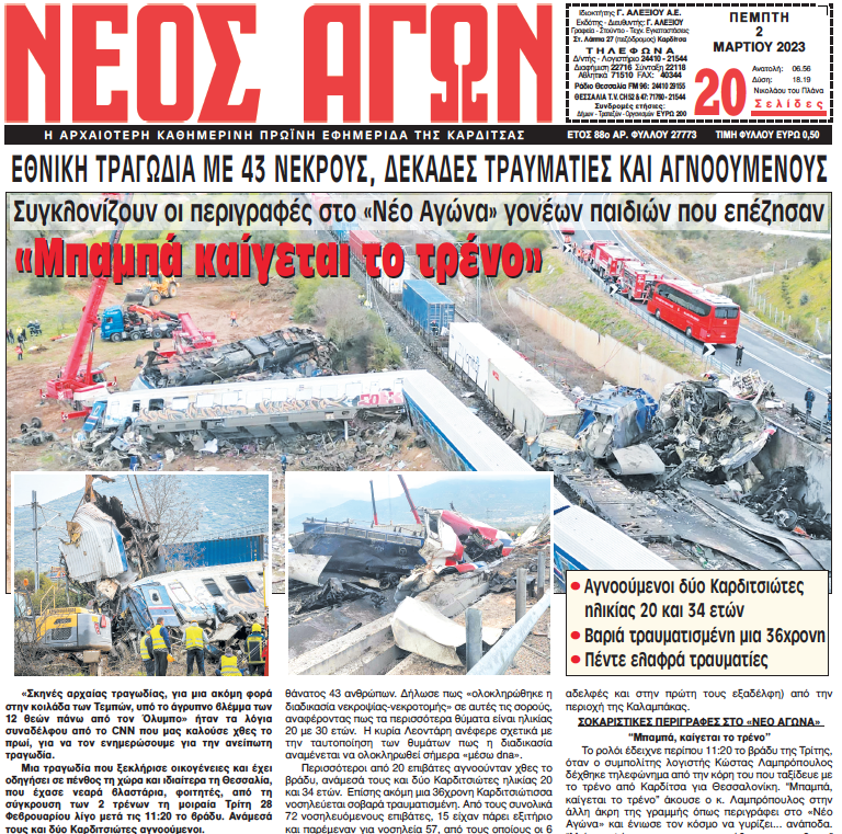 Δώδεκα μήνες μετά, παραμένουν αναπάντητα τα ερωτήματα της μεγαλύτερης σιδηροδρομικής τραγωδίας στην ιστορία της Ελλάδας, που κόστισε τη ζωή 57 ανθρώπων κυρίως νέων – φοιτητών. Ανάμεσά τους δύο δικά μας παιδιά, δύο νεαροί Καρδιτσιώτες που είχαν ολόκληρη τη ζωή μπροστά τους, ο Αναστάσιος Κουτσόπουλος και ο Βάιος Βλάχος.