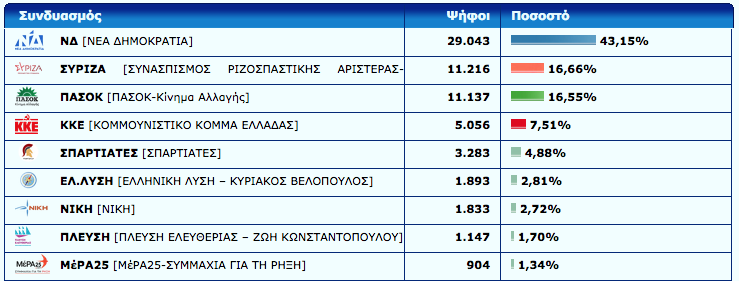 Τα αποτελέσματα στο Νομό Καρδίτσας με καταμετρημένο το 100% των εκλογικών τμημάτων, αναδεικνύουν πρώτο κόμμα τη ΝΔ με 43,15% (29.043).