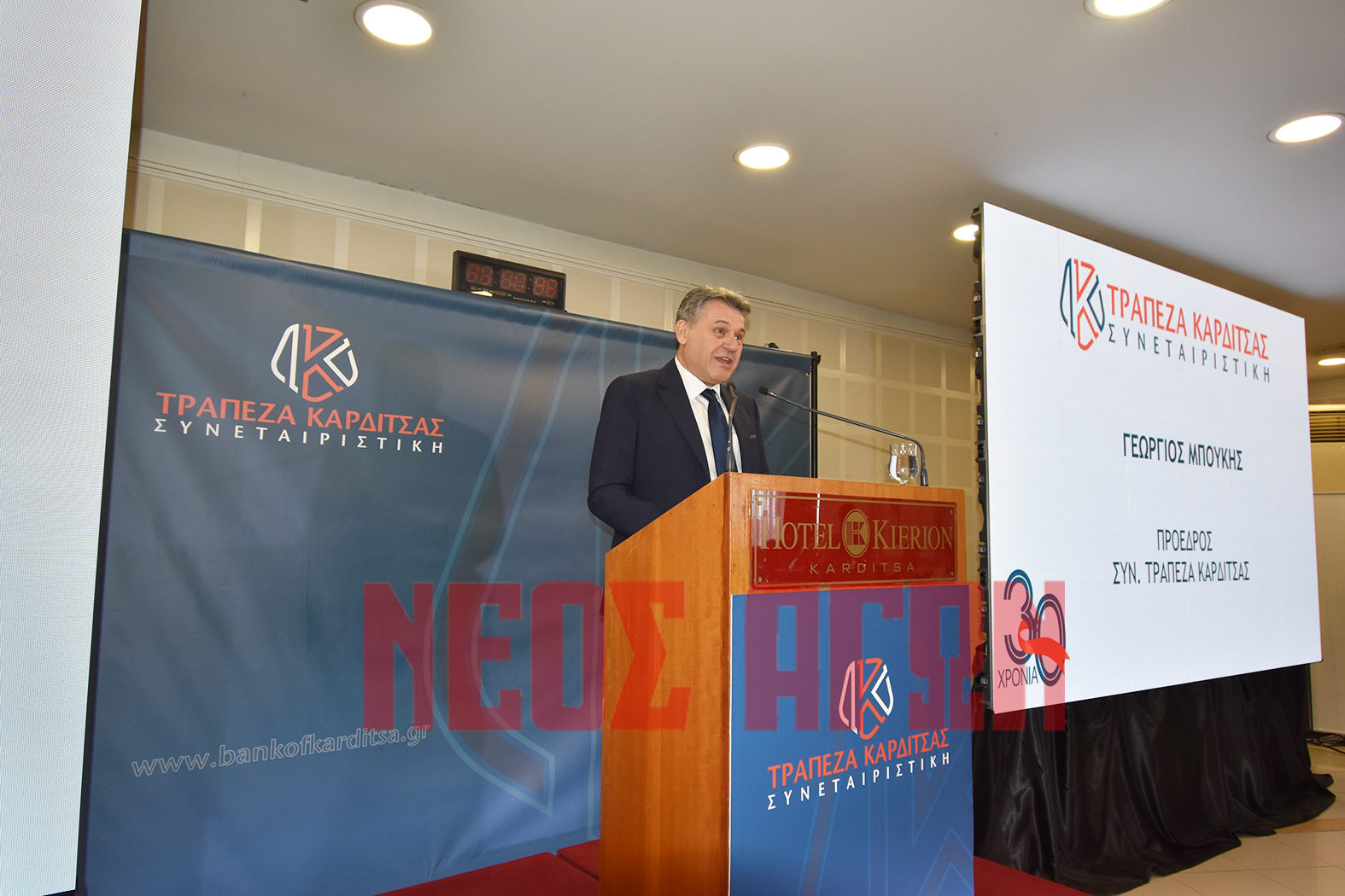 Ο Πρόεδρος της Συνεταιριστικής Τράπεζας Γιώργος Μπούκης στην ομιλία του επισήμανε ότι η Τράπεζα μετρά 30 χρόνια γεμάτα προκλήσεις, αγωνίες, επιτυχίες και ανεκτίμητη προσφορά στην τοπική και περιφερειακή ανάπτυξη. Πραγματοποιώντας μια ιστορική αναδρομή, σημείωσε ότι η 30ής ζωή της τράπεζας χωρίζεται σε τρεις περιόδους: