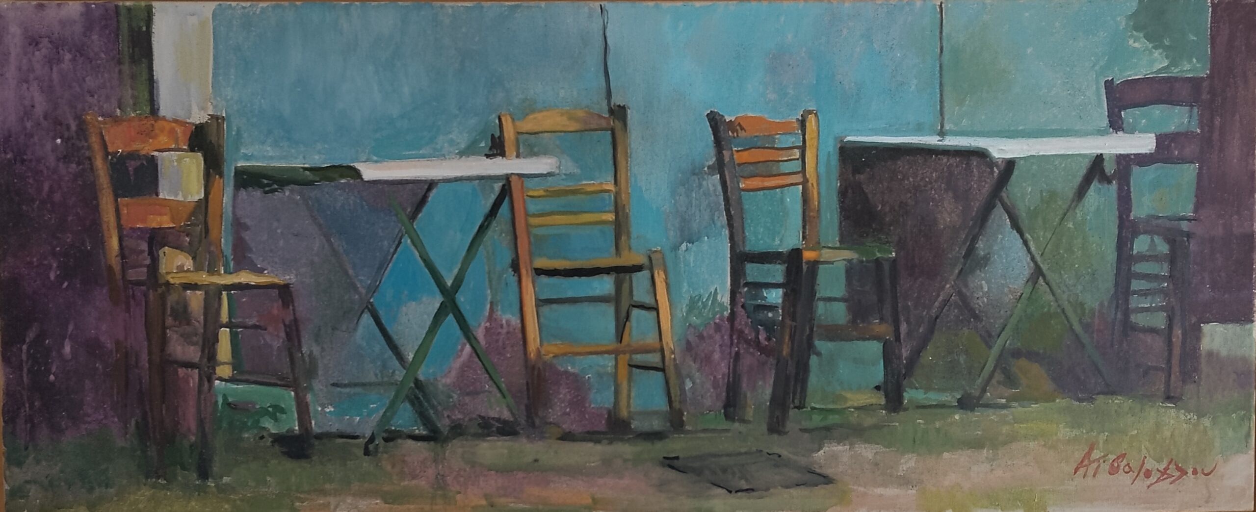 Ο Αχιλλέας Αϊβάζογλουυπηρετεί μια αισθαντική ζωγραφική. Ένα βλέμμα που περιπλανιέται στον χώρο κι εντοπίζει σημεία ενδιαφέροντος. Στο έργο: ‘παλιό καφενείο’ συναντώνται η τρυφερότητα του άνθρωπου που βλέπει, η παρουσία αυτού που παρατηρείται, η επίγευση της προσωπικής εμπειρίας και μαζί η καλά εξασκημένη τεχνική διαπραγμάτευση του δημιουργού. Τοπία της πόλης όπου σκηνογραφούνται στιγμές της καθημερινότητάς μας. Ο καλλιτέχνης αξιοποιεί τη δύναμη του χρώματος και την καθαρότητα του σχεδίου. Δημιουργεί ευρύχωρες χρωματικές περιοχές που εναλλάσσονται και αλληλοσυμπληρώνονται, έτσι καθώς ενοποιούνται τα αποδιδόμενα αντικείμενα, οι σκιές και ο χώρος που τα περιέχει. Εφαρμόζει αυστηρή παρατακτική δομή, τάξη και ρεαλιστική απεικόνιση που εν μέρει αίρεται από την αταξία που δημιουργεί η πατίνα του χρόνου. Το τελικό αποτέλεσμα είναι μια ατμοσφαιρική συνθήκη, παραστατική, γήινη και έντονα φορτισμένη από ζωή, αλλά και από την παροδικότητά της: τα πραγματολογικά στοιχεία, η εμπειρία, η οικειότητα, η φυσική φθορά, οι μνήμες και η νοσταλγία συμμετέχουν ταυτόχρονα και υποβάλλονται από τους ιδιαίτερους χρωματικούς τόνους που πλάθουν τα αναπαριστώμενα. Οι χειρονομίες του καλλιτέχνη, οι καταγραφές και οι αποσιωπήσεις του – όλα υπομνηματίζουν την ανθρώπινη παρουσία και / ή απουσία, το βίωμα, την προσωπική εμπλοκή, την ενδοσκόπηση και τα συναισθηματικά φορτία από το μικρο-κλίμα και τη ζωή της πόλης. Το έργο: ‘παλιό καφενείο’, όπως και τα υπόλοιπα έργα του καλλιτέχνη,προσφέρει απόψεις της καθημερινότητας, του σύγχρονου βίου ιδιαίτερα της πόλης. Εντάσσεται στην εικαστική συλλογή της ΔΠΚ, έτοιμο να ενεργοποιήσει συνομιλίες σε ενδεχόμενα μουσειολογικά σενάρια.