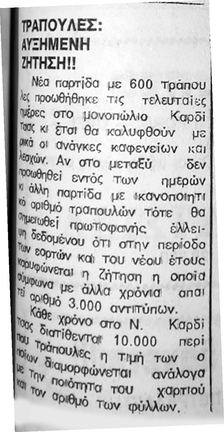 Έγραφε λοιπόν ο «Νέος Αγών» τέτοιες ημέρες το 1984 ότι προωθήθηκε νέα παρτίδα με 600 τράπουλες ώστε να καλυφθούν μερικώς οι ανάγκες καφενείων και λεσχών στην Καρδίτσα. Προειδοποιούσε μάλιστα ότι αν προωθηθεί εντός των ημερών και άλλη παρτίδα με ικανοποιητικό αριθμό τραπουλών τότε θα σημειωθεί πρωτοφανής έλλειψη, δεδομένου ότι στην περίοδο των εορτών και του νέου έτους κορυφώνεται η ζήτηση η οποία σύμφωνα με άλλα χρόνια απαιτεί αριθμό 3.000 αντιτύπων.
