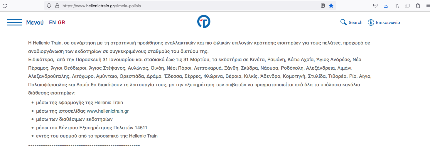 Στην ανακοίνωσή της αναφέρει: «Η Hellenic Train, σε συνάρτηση με τη στρατηγική προώθησης εναλλακτικών και πιο φιλικών επιλογών κράτησης εισιτηρίων για τους πελάτες, προχωρά σε αναδιοργάνωση των εκδοτηρίων σε συγκεκριμένους σταθμούς του δικτύου της.