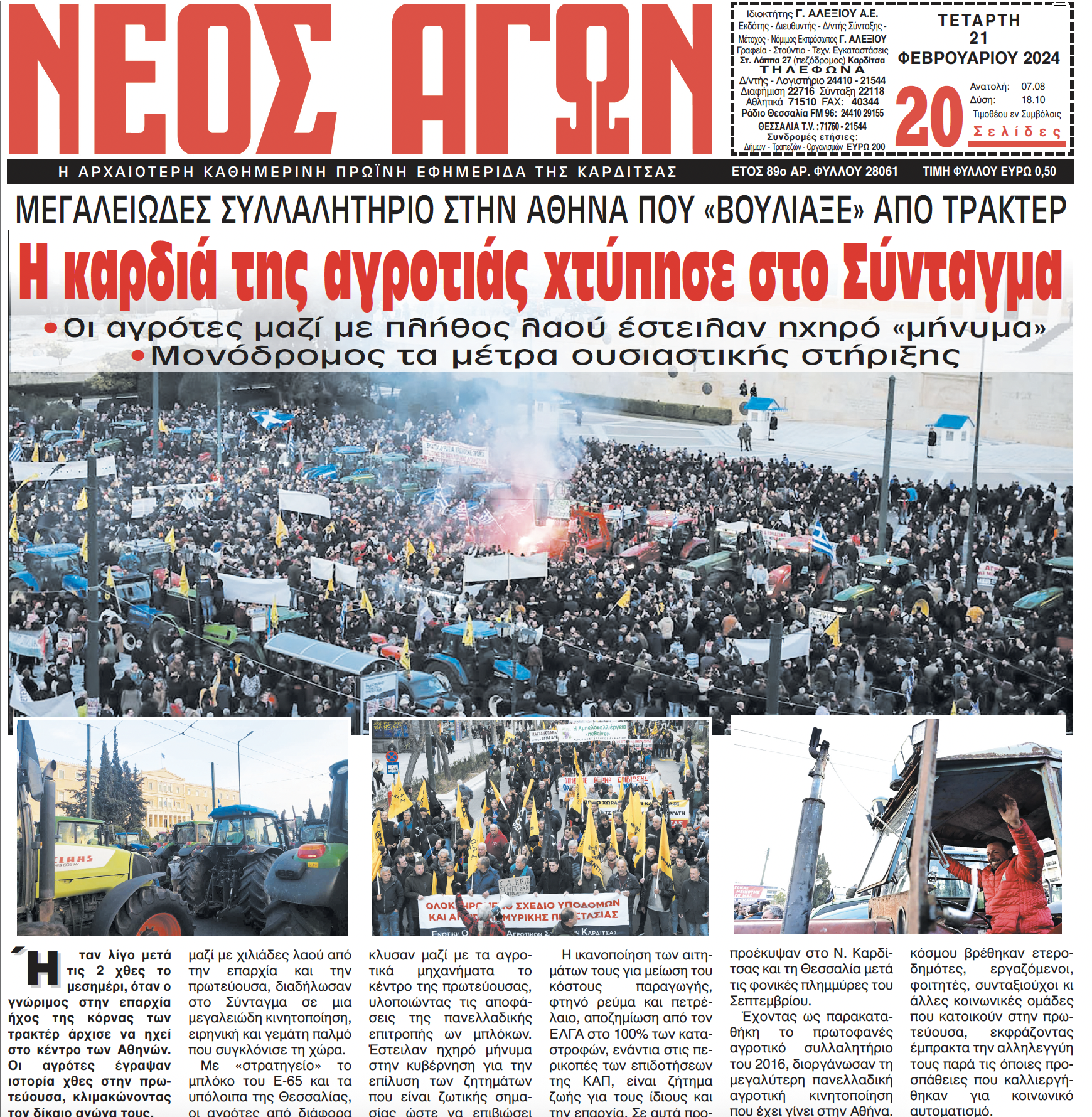 Λίγα χρόνια αργότερα, στις 20 Φεβρουαρίου 2024, η ιστορία επαναλήφθηκε. Δεκάδες τρακτέρ και χιλιάδες διαδηλωτές βροντοφώναξαν τα αιτήματα τους, έχοντας στο πλευρό τους τη συγκινητική συμπαράσταση της κοινωνίας. Ετεροδημότες, φοιτητές και εργαζόμενοι ενώθηκαν με τους αγρότες, αποδεικνύοντας πως ο αγώνας για την επιβίωση της υπαίθρου είναι αγώνας ολόκληρου του λαού.