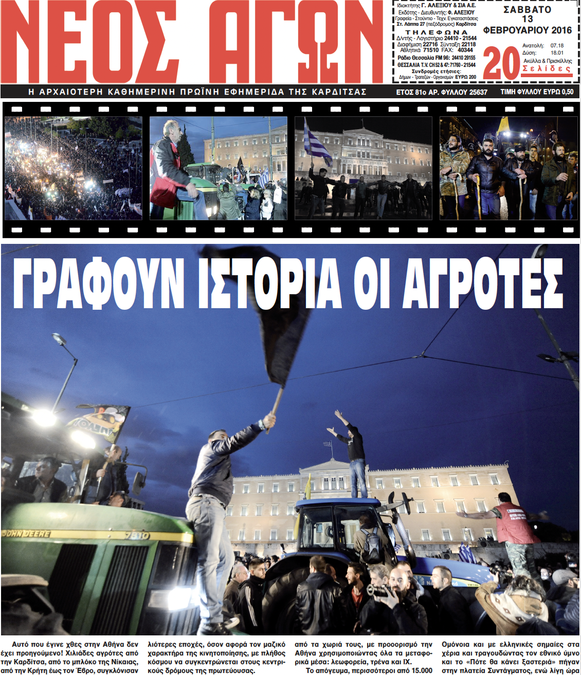 Τέτοιες ημέρες πριν από μια δεκαετία, στις 12 Φεβρουαρίου 2016, το αγροτικό κίνημα έγραψε ιστορία. Ήταν η μεγαλύτερη πανελλαδική αγροτική κινητοποίηση που είδε ποτέ η χώρα, με χιλιάδες αγρότες από το μπλόκο της Νίκαιας, από την Κρήτη έως και τον Έβρο, να πλημμυρίζουν την Πλατεία Συντάγματος. Η εικόνα των τρακτέρ από το Πανθεσσαλικό μπλόκο έξω από τη Βουλή είχε συγκλονίσει το πανελλήνιο.
