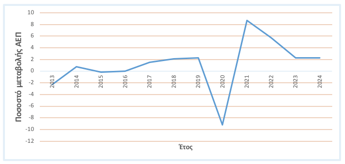Για να έχουμε μια συνολική εικόνα για την εξέλιξη του ΑΕΠ στην Ελλάδα παρατίθεται το διάγραμμα, στο οποίο φαίνεται η μεταβολή του ΑΕΠ από το 2013 έως το 2024. Το 2013 παρατηρήθηκε μια αρνητική τιμή, από το 2014 έως το 2016 μια μικρή ανοδική τάση, από το 2018 έως το 2019 η ανοδική τάση ενισχύθηκε, το έτος 2020 λόγω του COVID παρατηρήθηκε μια καθίζηση, η οποία αναπληρώθηκε το 2021, ενώ στη συνέχεια παρατηρήθηκε μια σταθερή ανοδική πορεία. Σύμφωνα με τα στοιχεία της ΕΛΣΤΑΤ, με αναγωγή σε τιμές του 2020, το έτος 2013 είχαμε ΑΕΠ 173.265 εκατ. €, το έτος 2015 ΑΕΠ 174.239 εκατ. € και το έτος 2024 είχαμε ΑΕΠ 201.459 εκατ. €.